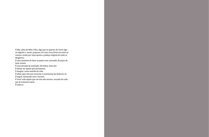 F.Ilha, além de fi lha é ilha, algo que se apartou de outro algo ou alguém e, assim, pequena, foi virar terra fi rme em meio ao oceano, tendo por vista oposta o pedaço original de onde se desgarrou. É uma tentativa de fazer as pazes com a jornada, de parar de lutar contra. É uma jornada de aceitação. De beleza. Sem dor. É deixar ser aquilo que permanece. É sangrar, como sentido da vida. É olhar para trás sem encerrar o movimento de deslocar-se. É seguir, dançando com o incerto. É viver tudo aquilo que em nós não morreu, cercado de tudo que já tentaram matar. É sobre ir.