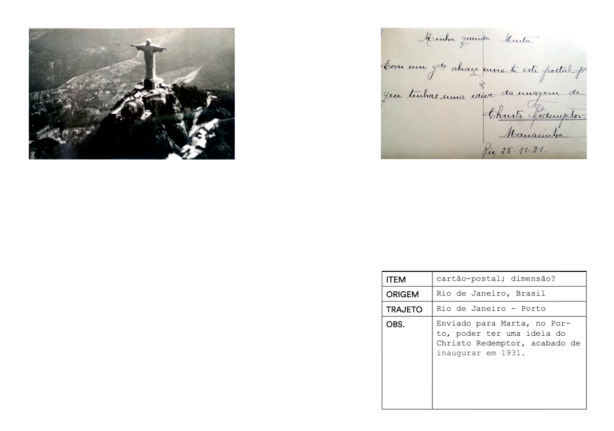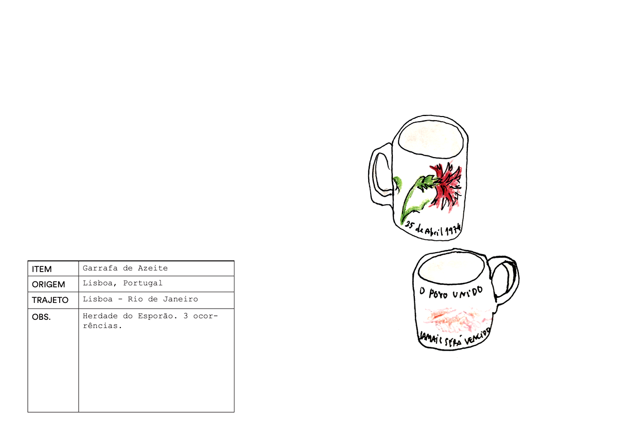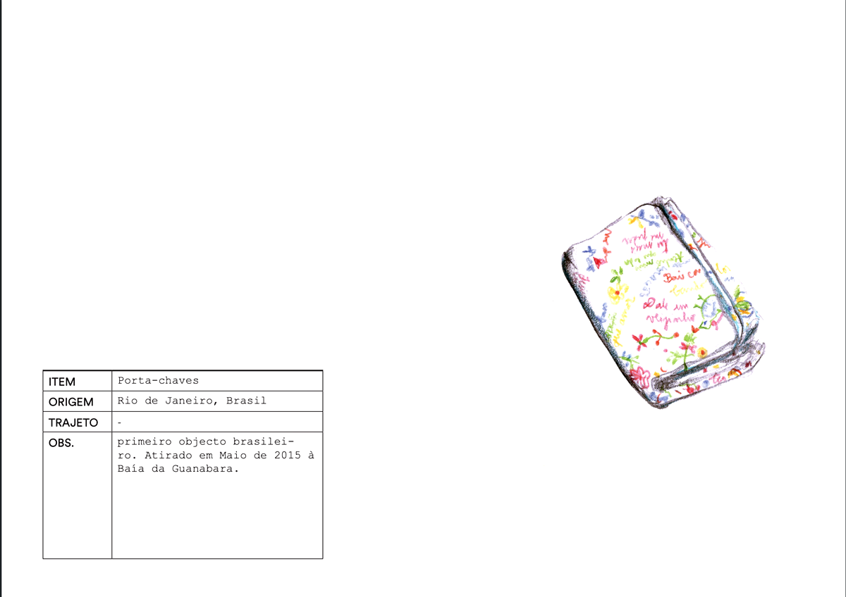 Num primeiro momento, o projecto consistiu numa instalação de objectos pessoais trazidos de Portugal para o Brasil, diários de campo, diapositivos, narrativas e impressões fotográficas. A instalação decorreu de 6 a 8 de Outubro de 2016 na #8 Monográfica da galeria Saracvra, no Rio de Janeiro e foi acompanhada de uma publicação. Esta explorava o conceito de catálogocomo elemento compósito, documental e classificatório das coisas em análise: objectos que circularam nas malas de portugueses em trânsito entre Portugal e o Brasil entre 2015 e 2017 / souvenirs fotográficos na trama de correspondência entre os dois países até inícios da década de 1970.