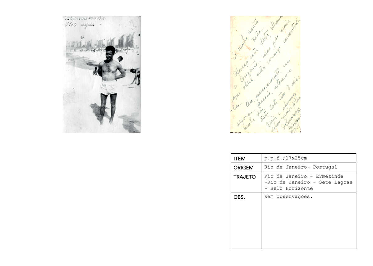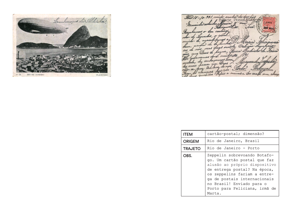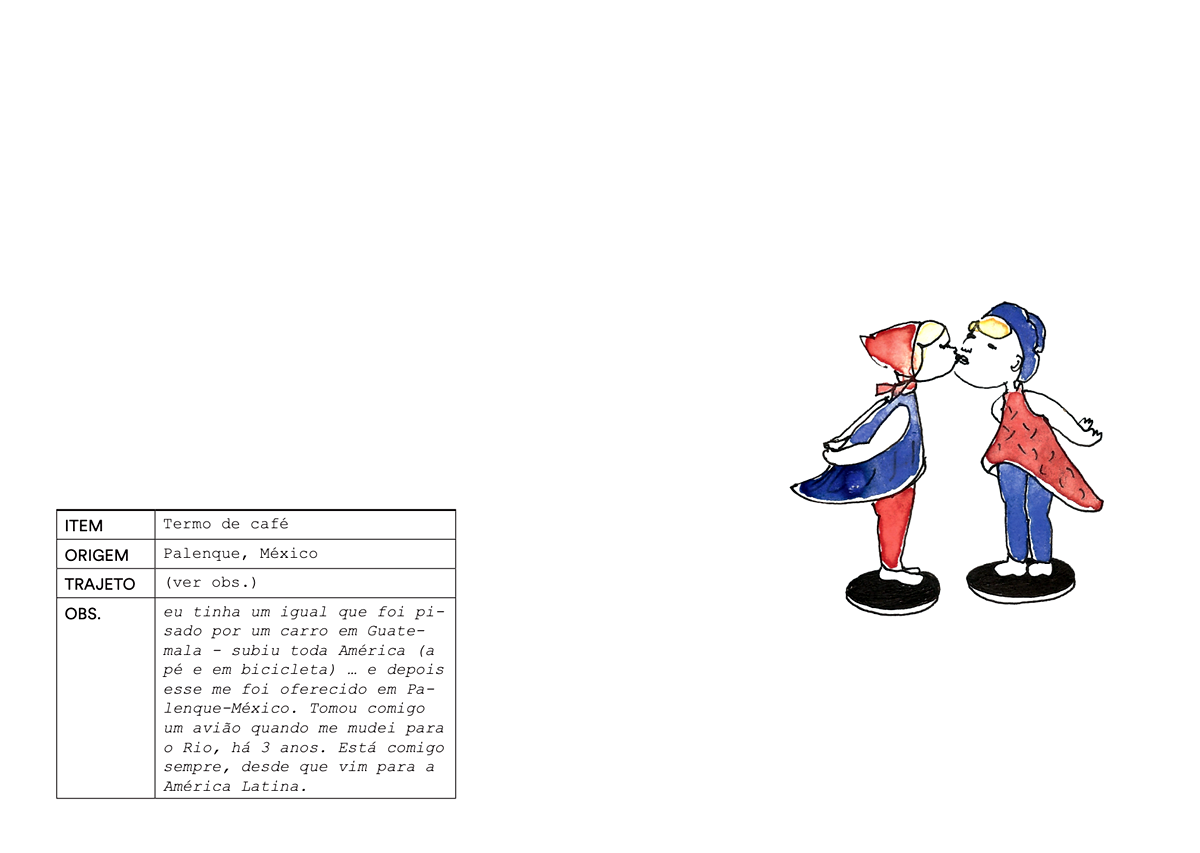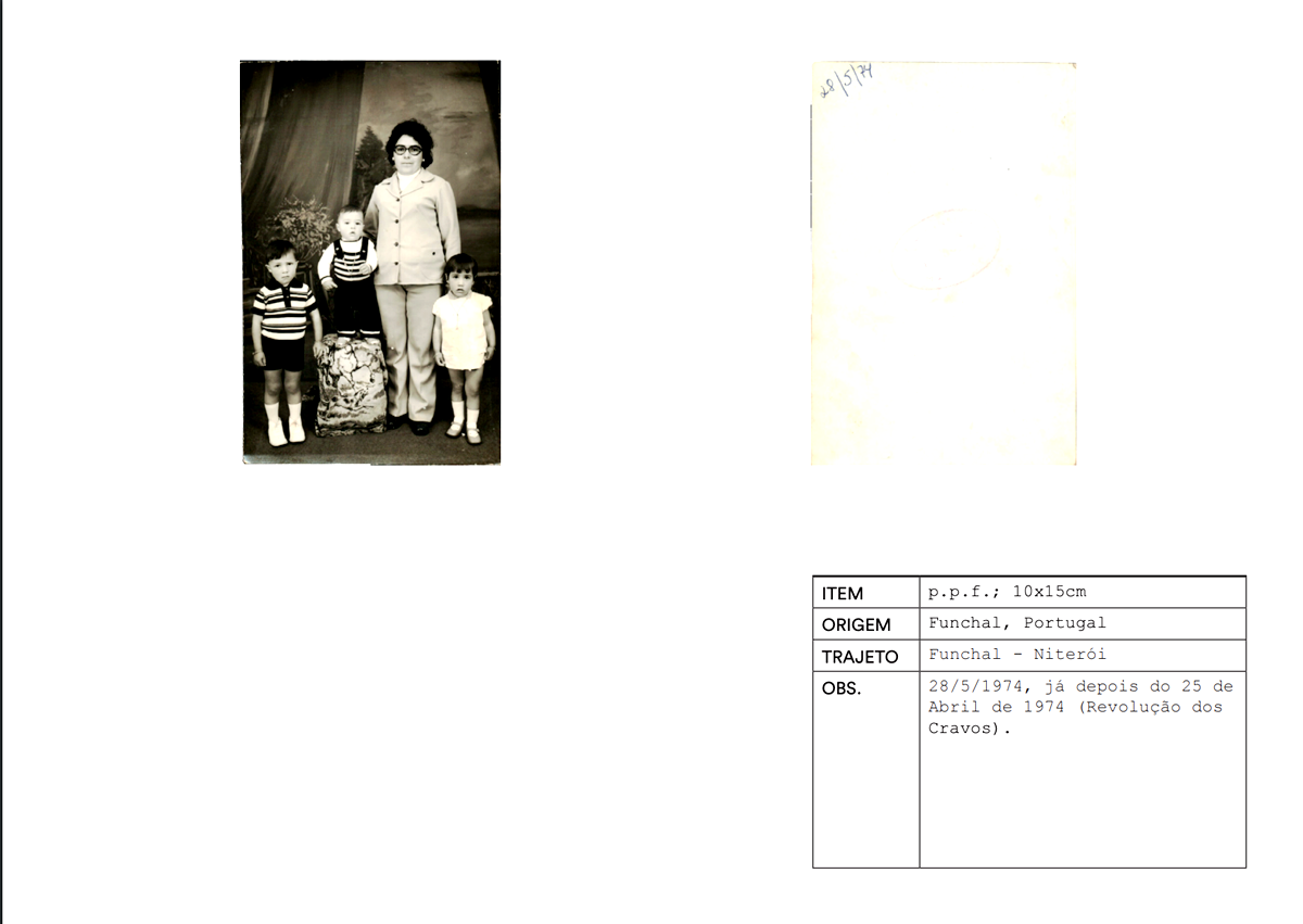Num primeiro momento, o projecto consistiu numa instalação de objectos pessoais trazidos de Portugal para o Brasil, diários de campo, diapositivos, narrativas e impressões fotográficas. A instalação decorreu de 6 a 8 de Outubro de 2016 na #8 Monográfica da galeria Saracvra, no Rio de Janeiro e foi acompanhada de uma publicação. Esta explorava o conceito de catálogocomo elemento compósito, documental e classificatório das coisas em análise: objectos que circularam nas malas de portugueses em trânsito entre Portugal e o Brasil entre 2015 e 2017 / souvenirs fotográficos na trama de correspondência entre os dois países até inícios da década de 1970.
