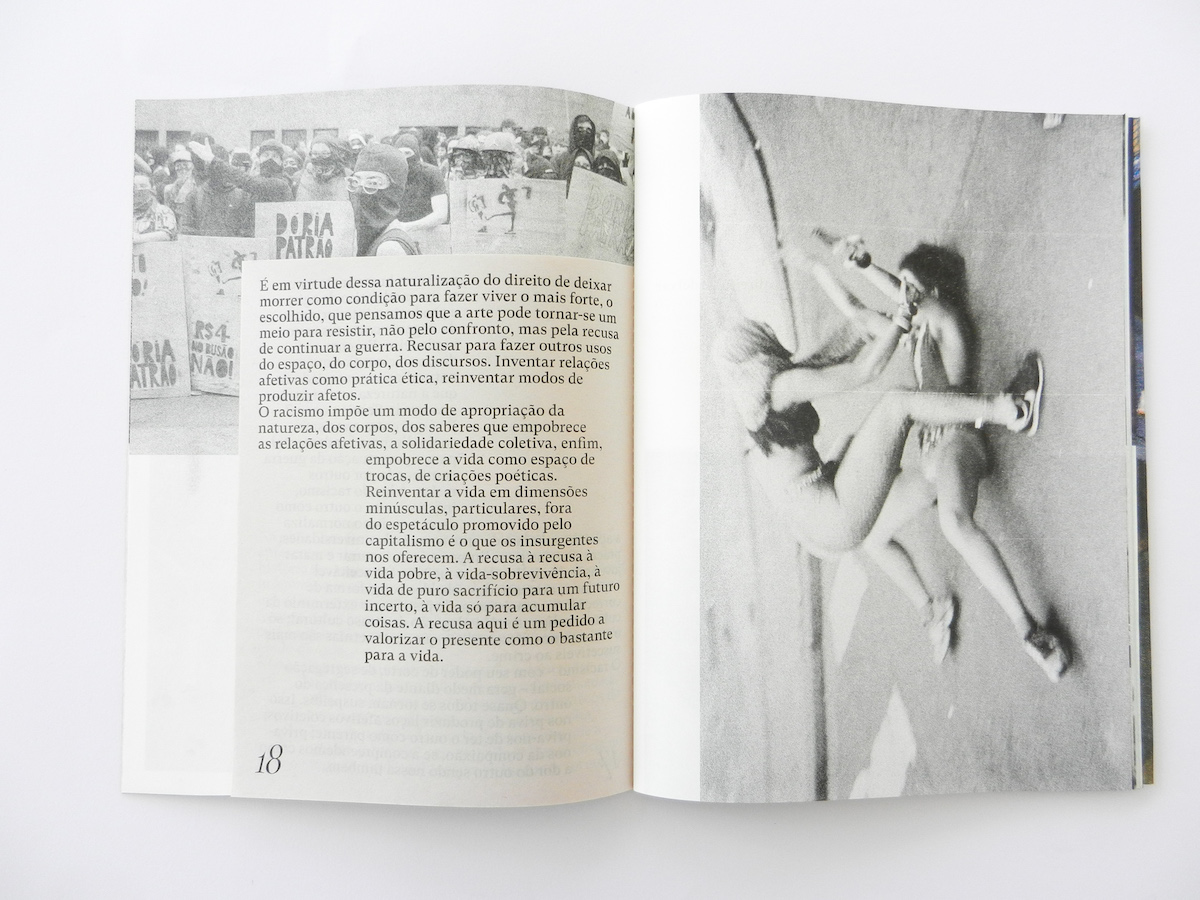 “O fotolivro apresenta imagens de protestos, mas esta não é uma frase que resolve o livro. O que vemos são registros de atos políticos. Não apenas aqueles convencionais, com cartazes nas ruas, mas também de festas e outros eventos. Em comum, todos propõem um embate físico com forças repressoras das mais diversas instâncias.