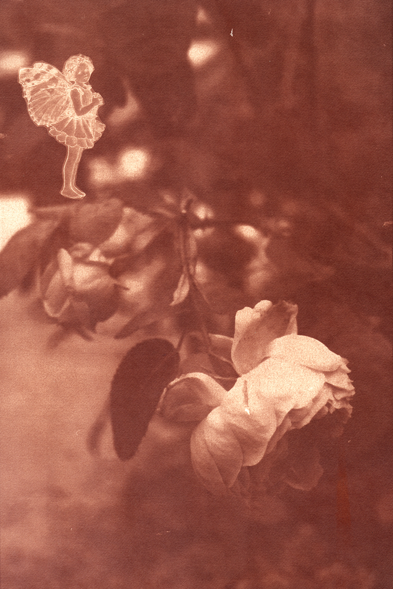 No meu trabalho utilizo as ilustrações de fadas da inglesa Cicely Mary Barker (1895-1973), recortei-as, coloquei-as em plantas de um jardim e depois fotografei-as. O próximo processo é o uso de um processo histórico (Photogenic Drawing Process – 1834). Algumas imagens, devido ao processo de Desenho Fotogênico, desaparecem com o tempo.