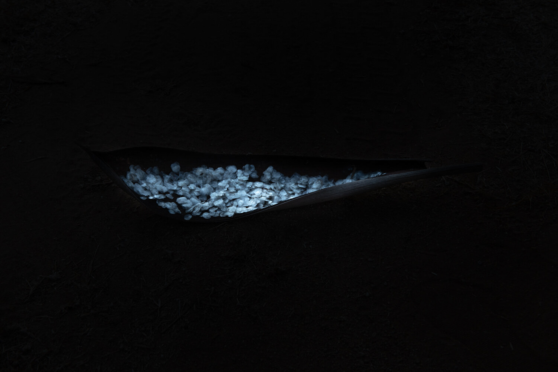 O ato fotográfico se dá a partir de uma dupla cegueira. Não ver pelo gesto de tornar-se objeto da própria captura, dar-se a câmera como imagem, perder o controle do olhar através da autoperformance realizada para a câmera. E não ver por uma questão ótica, pela ausência de luz. Fotografar cenas que apenas a câmera é capaz de revelar, que o olho não alcança. O duplo gesto, de fotografar e de performatizar, é concebido a partir da imaginação e dos sentidos, uma vez que a paisagem só é revelada após o clique. Por outro lado, o trabalho se dá como uma expedição pela noite movida pela intenção de captura dos últimos resquícios de luz e brilho, que é conduzida por pequenas descobertas e intervenções com objetos de qualidade brilhante que guardam semelhança com o os astros e as luzes noturnas.