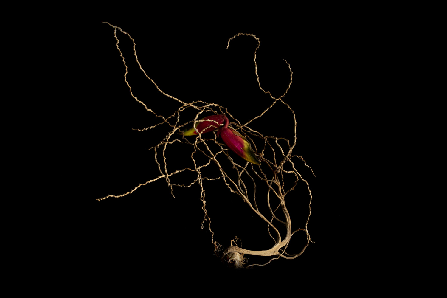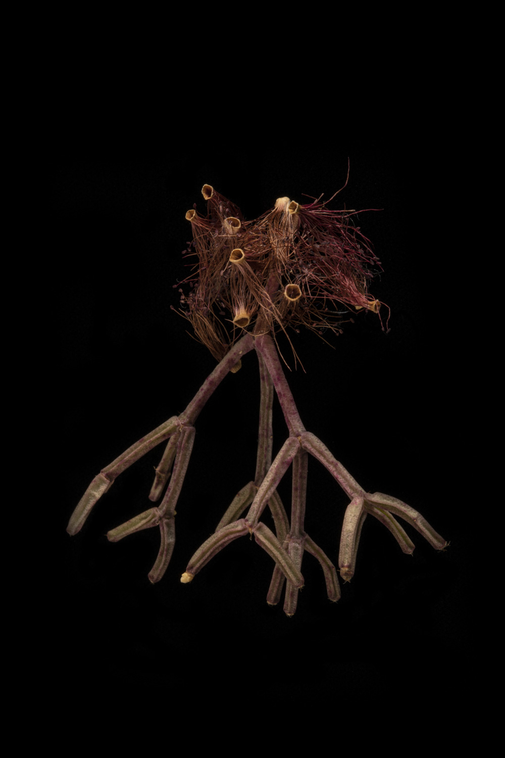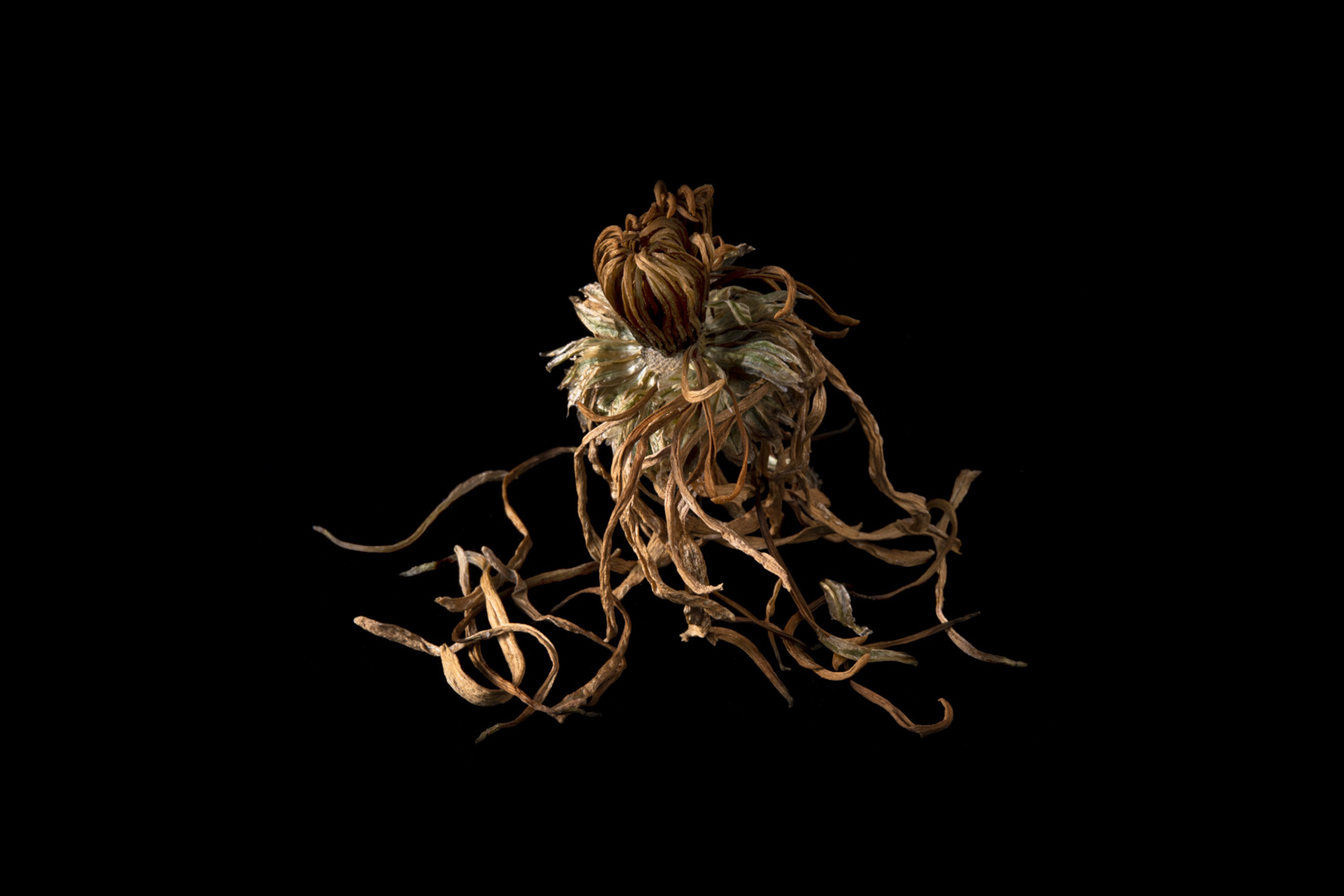 Durante o caminhar cotidiano desperto para observação da natureza e para curiosidade sobre espécies familiares ou desconhecidas. O olhar busca figuras diversas durante o trajeto e o deslocamento transforma-se numa rotina de coleta. Um cientificismo imaginado que surge a partir do encantamento com folhas, flores ou galhos. Carrego os objetos da natureza para fora de seu habitat. Levados para o estúdio, são colocados, um a um, sobre fundo preto neutro. Transplantados e isolados assumem nova identidade. Convivo com as formas, por breves momentos, ainda frescas. Às vezes registro logo que chegam, como são. Outras, aguardo que murchem, sequem, apodreçam. Dá-se a construção da luz. Da transformação, para esculpi-los no tempo e no formato, para depois congelá-los pelo registro fotográfico.
