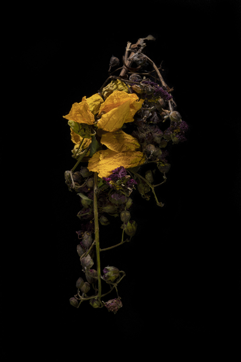 A investigação dos contornos e cores sob diferentes ângulos de incidência de luz e a manipulação que transfigura, marca a passagem do tempo. A beleza da juventude que habita o imaginário coletivo em detrimento da velhice é questionada. O desgaste refutado e escondido se expõe. A investigação que poderia somente evidenciar as marcas do tempo aponta para uma revalorização do que se deteriora. Florescer e murchar, nascer e morrer. A degradação revela um novo existir. A natureza não é morta.