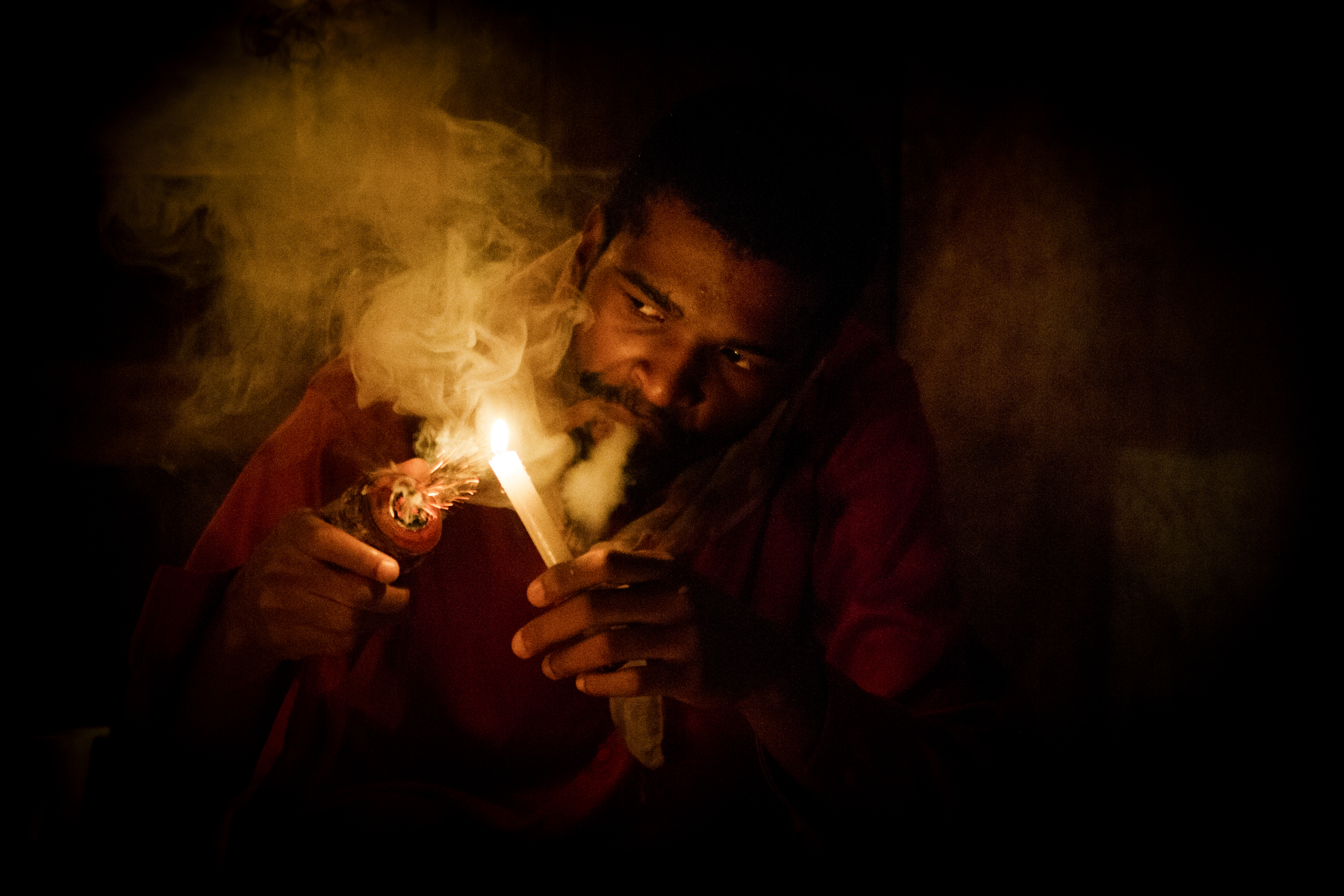 O ensaio “Festa no Terreiro Mágico” nos guia pela intimidade do maracatu de baque solto Cambinda Brasileira, de Nazaré da Mata. Com o olhar interessado no aspecto humano, Heudes Regis revela nas imagens uma realidade pouco clicada na brincadeira: seus bastidores. Os folgazões aparecem nos ensaios, nas sambadas, fazendo preparação espiritual, às vésperas das apresentações e, também, nos dias de Carnaval.