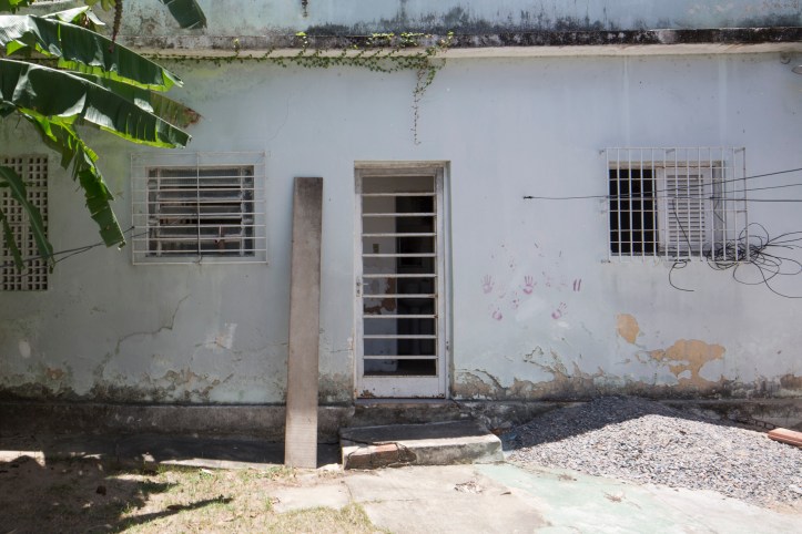 Ambiente externo com claridade, mostra ao fundo pequena casa com duas janelas com grades de metal pintadas de branco. A janela da esquerda encontra-se fechada e a da direita semiaberta. No centro há uma porta aberta com grade branca. Ao lado esquerdo da porta há uma tábua encostada na parede frontal. Ao lado direito, marcas de mãos sobre a parede feitas com tinta roxo-claro e parede com revestimento descascado. A esquerda superior do ambiente, algumas folhas de bananeira e área mais sombreada da imagem. Vegetação rala se alastrando pelo beiral superior da casa. Há um degrau com desgaste e tijolo aparente de acesso à porta central. Ao lado desse acesso, há um pequeno monte de britas, para eventual reforma. Há um fio esticado como varal preso à parede frontal. Chão de cerâmica manchado.