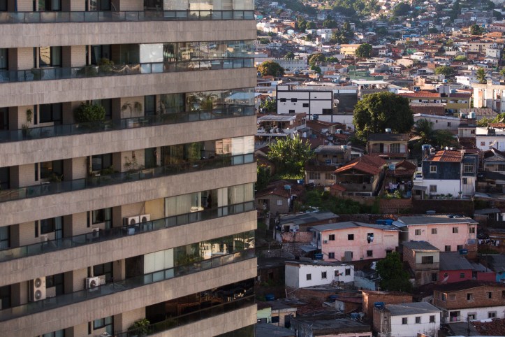 Ambiente panorâmico externo, mostrando paisagem urbana. Segundo plano da imagem de casas de tamanhos variados, vegetação de plantas e árvores frutíferas, ao fundo ruas e casas inclinadas em um morro. Primeiro plano, fachada de prédio residencial, contendo janelas e varandas de vidro, ornamentado com plantas e contendo aparelhos de ar condicionado. Contrastando com as residências do subúrbio.
