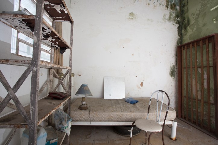Ambiente interno com pouca claridade, ao fundo da imagem parede branca com pequenas manchas, cama de solteiro feita de metal enferrujado, contendo colchão velho, sobre o mesmo, abajur pequeno, com base de metal e cúpula empoeirada de cor azul, espelho de porte médio recostado sobre a parede e pequena toalha de rosto com listras de cor azul. Abaixo da cama pneu de carro. A esquerda do ambiente, janela de basculante, com cortina de tecido recostada na parede. Armário de metal enferrujado com cinco prateleiras, a quarta prateleira de cima para baixo, contém um telefone de cor vermelho, com teclas numéricas de cor preta. Na quinta prateleira, próximo ao chão, tem um recipiente plástico com alça de cor branca, ao lado pequena lata retangular de tinta, sacos contendo tinta em pó. Junto à cama, cadeira de metal com assento de formato circular. À direita da imagem, grade de madeira de cama de casal encostada em parede úmida com manchas. Chão de cerâmica manchado.