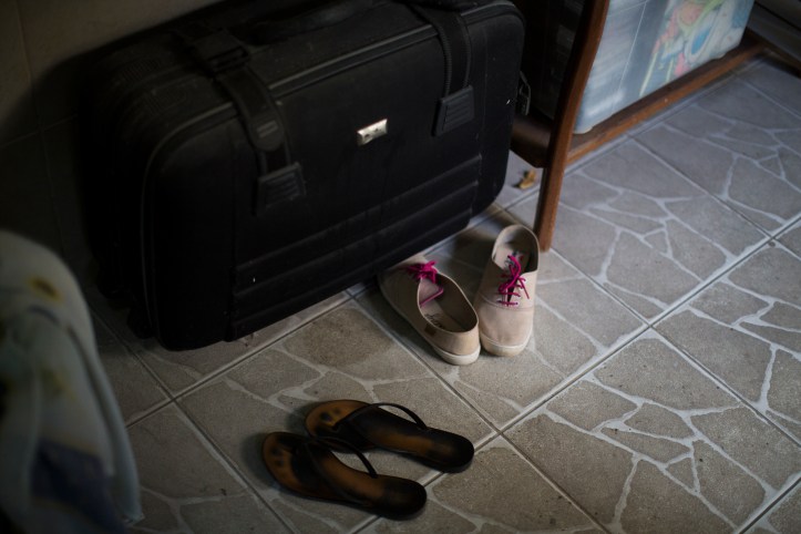 Ambiente interno, focalizando o chão do ambiente. Contendo móvel de madeira, com caixa de papelão. Mala com alça de cor preta, há um par de sapatilha de pano de cor clara e cadarço de cor rosa. E um par de chinelos de dedo em couro, evidenciando desgaste com marcas de pé e dedos. E objeto de cor branca desfocado na parte inferior à esquerda do ambiente. Chão coberto por azulejos com estampa de lajedos de pedras.