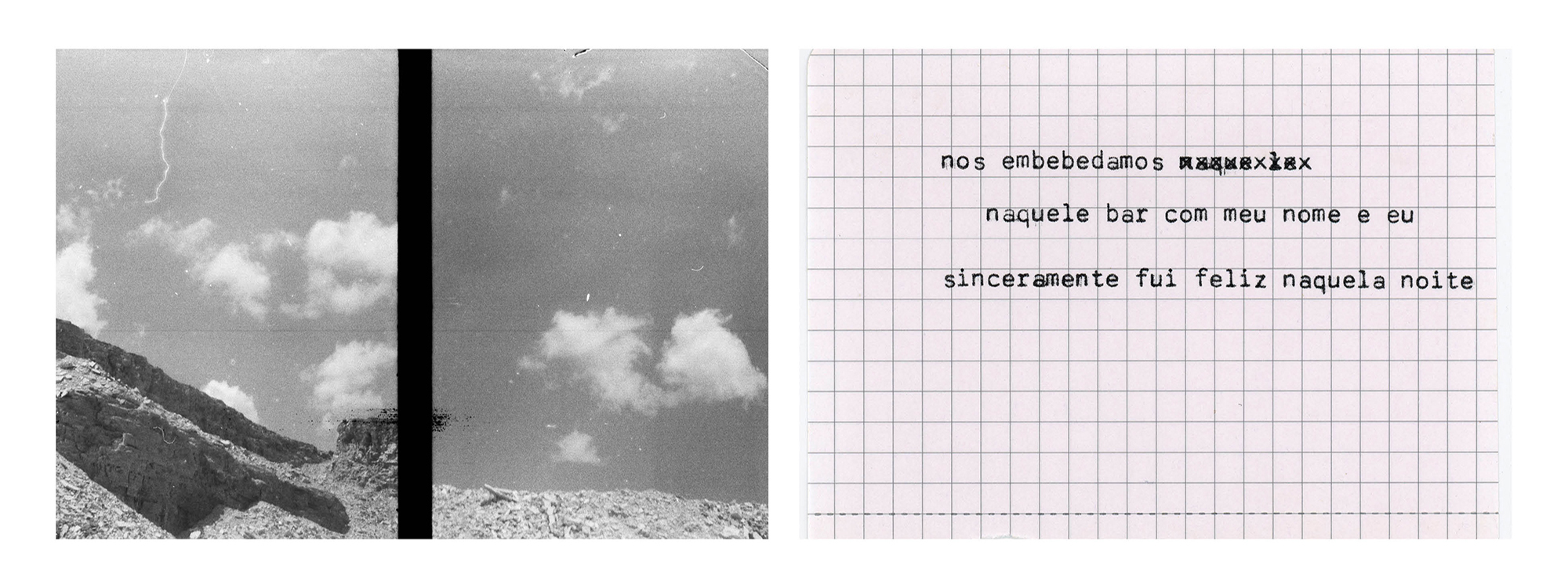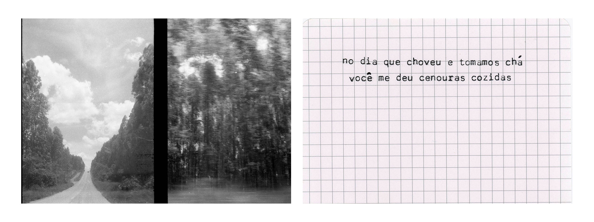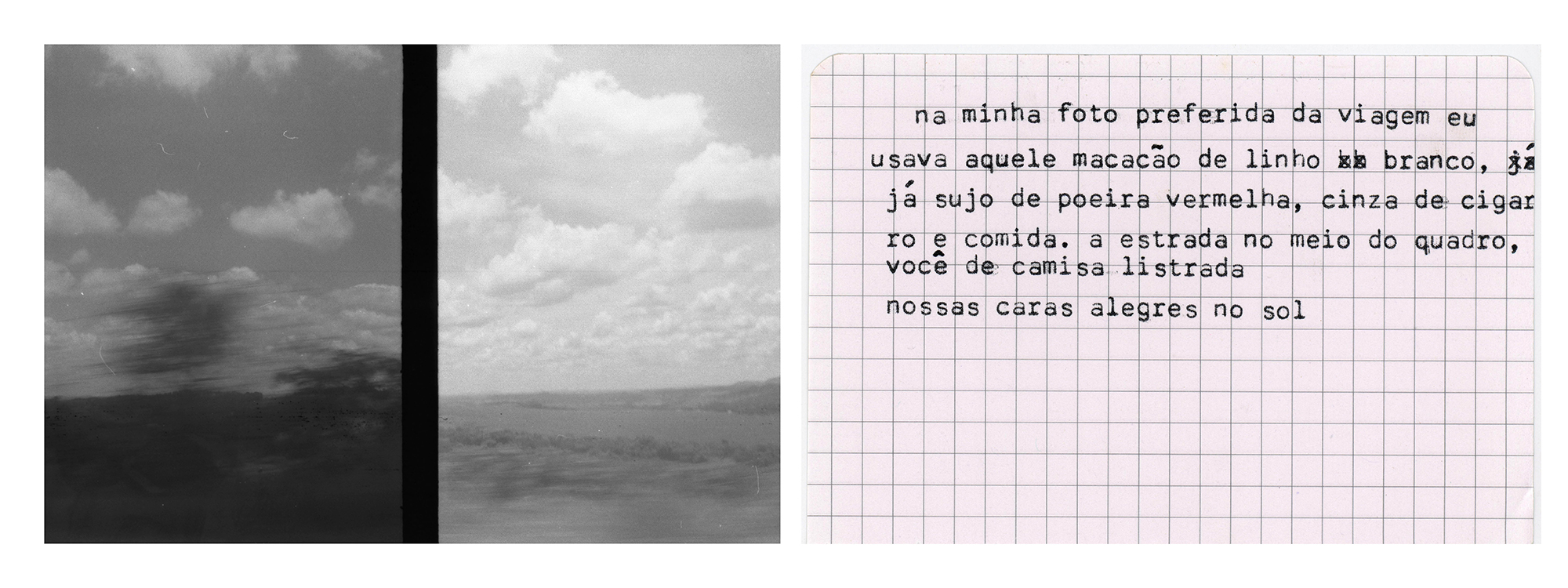Quando palavra e imagem se misturam para compor narrativas, essa fricção pode se dar também por dissidência e choque. É assim que construo “Viagem de ano novo”, ensaio em que fotografias analógicas em pb feitas com uma Olympus pen – que duplica os frames – aparecem ao espectador junto a textos datilografados, reunindo em cada quadro/peça/imagem memórias de momentos distintos de uma viagem por Minas Gerais em 2019. As fotografias são todas feitas de dentro do carro em que percorri a extensão do estado desde Belo Horizonte até São Paulo e os textos advém de situações vividas durante as paradas nas cidades que compuseram o roteiro.
