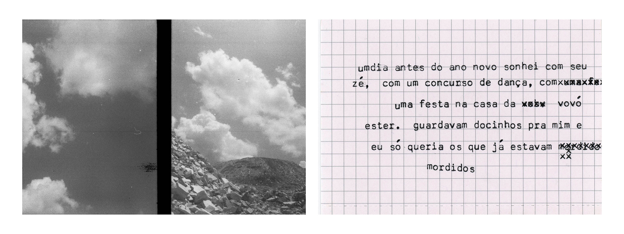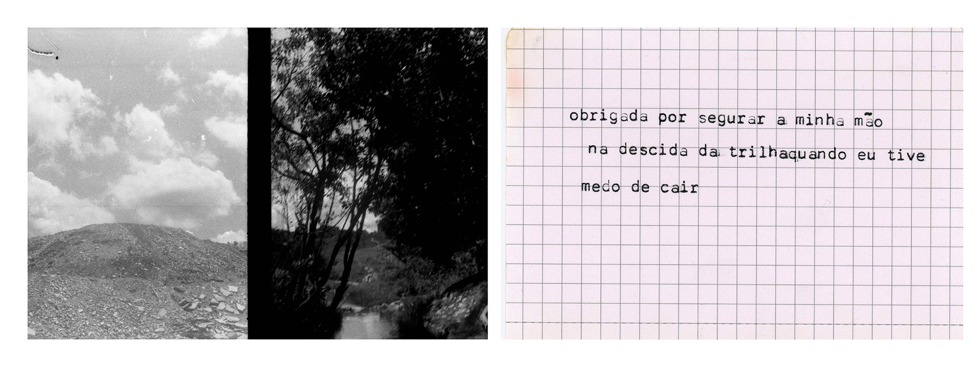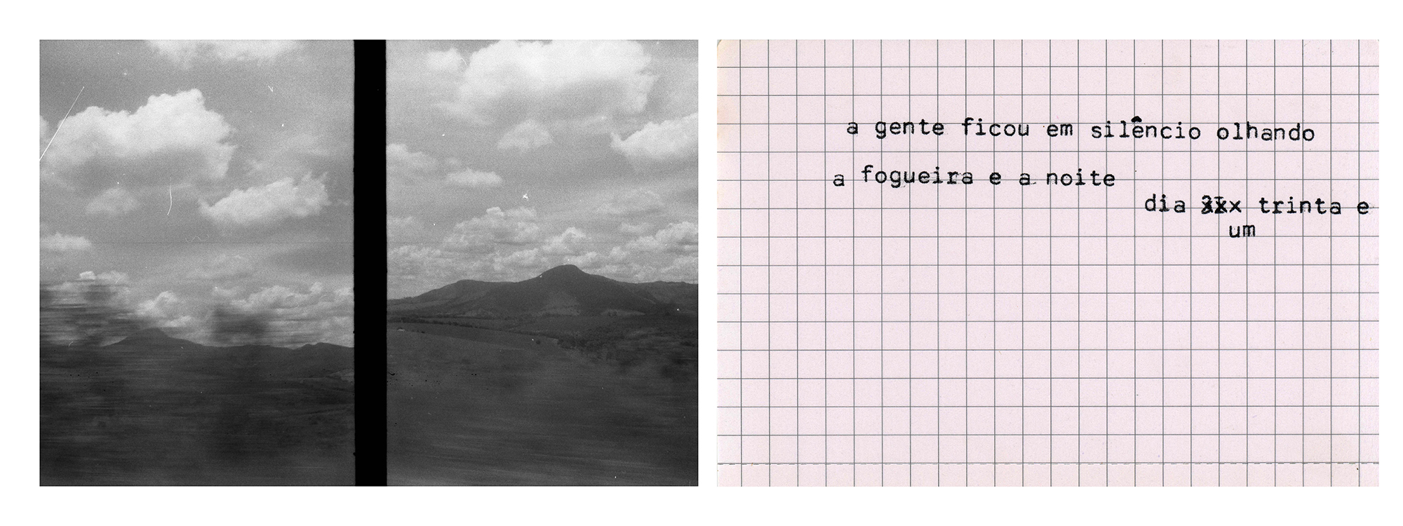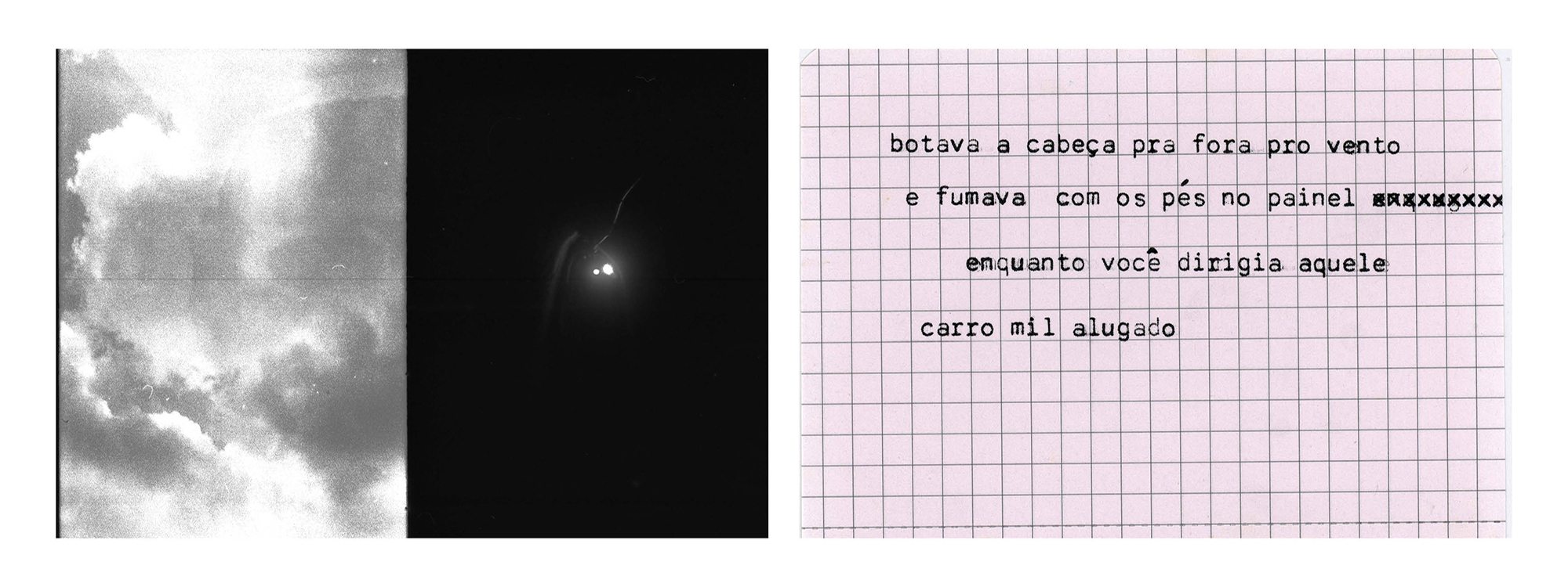 Quando palavra e imagem se misturam para compor narrativas, essa fricção pode se dar também por dissidência e choque. É assim que construo “Viagem de ano novo”, ensaio em que fotografias analógicas em pb feitas com uma Olympus pen – que duplica os frames – aparecem ao espectador junto a textos datilografados, reunindo em cada quadro/peça/imagem memórias de momentos distintos de uma viagem por Minas Gerais em 2019. As fotografias são todas feitas de dentro do carro em que percorri a extensão do estado desde Belo Horizonte até São Paulo e os textos advém de situações vividas durante as paradas nas cidades que compuseram o roteiro.