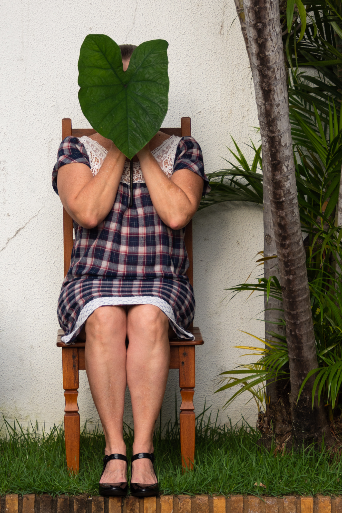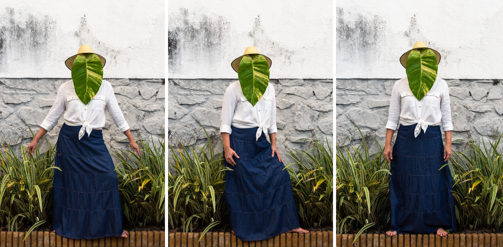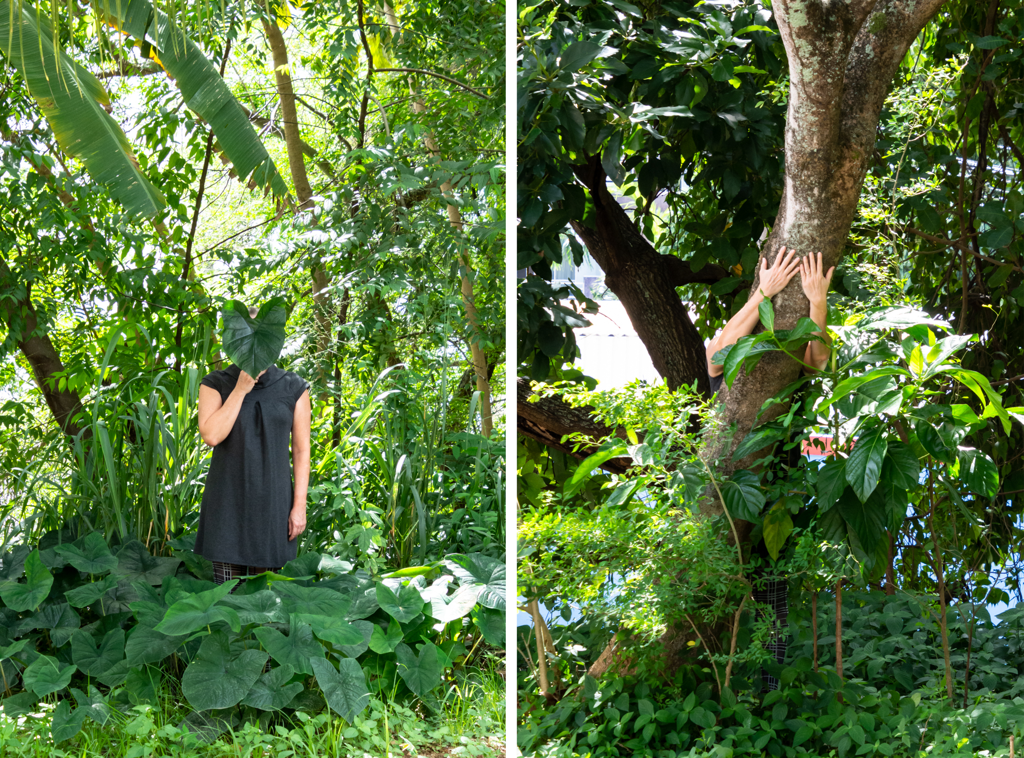 Foi, ao caminhar pelos arredores de meu corpo e do espaço que ocupo nesse mundo, que pude sentir a força vital da natureza e a importância da sua existência. Eu sou parte do todo, não sou uma coisa e a natureza outra. Descobri tantas belezas que eu mal consigo explicar a mim mesma. Todos esses sentimentos me fazem entender que é imprescindível cuidar, proteger, me envolver, me reintegrar a esse mundo chamado natural do qual fui afastada pela cultura. A série Arredores surgiu da experimentação desse envolvimento com a natureza, eu quis brincar de ser árvore, de ser planta, eu quis ser parte. Eu quis sentir, tocar, me enraizar. Também propus-me pensar as relações entre natureza e cultura ao abusar da pose, das roupas, da estranheza gerada pela ausência de uma identidade específica pela obliteração do rosto.