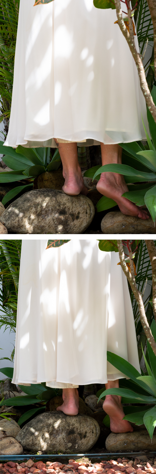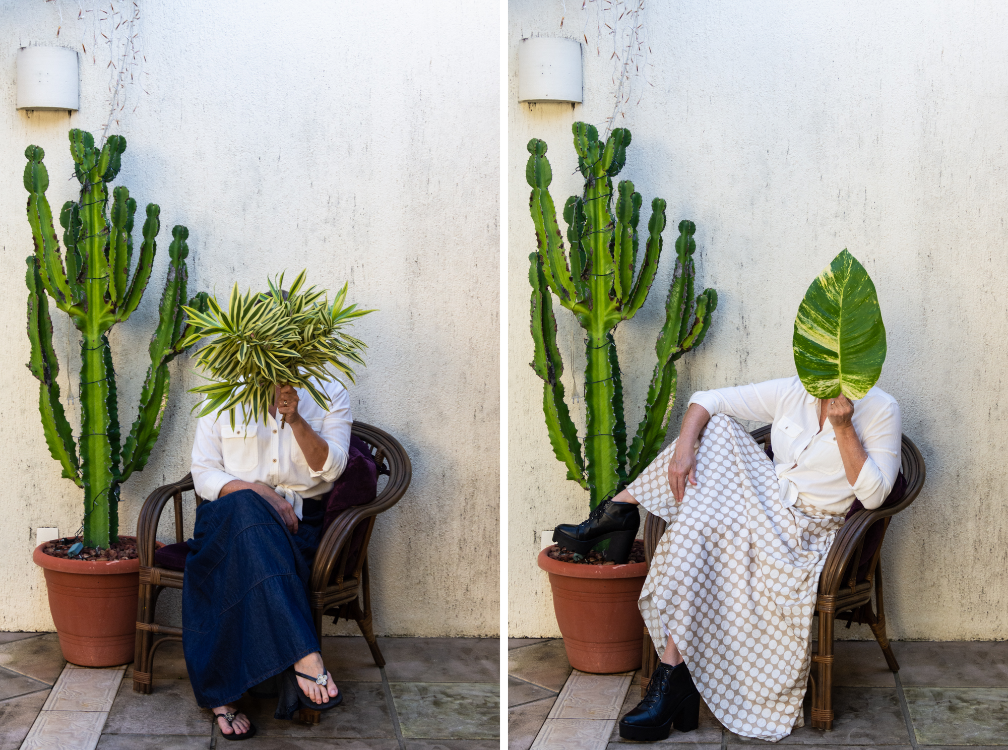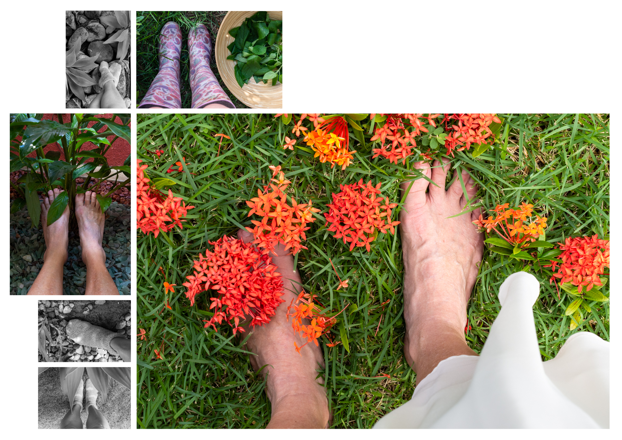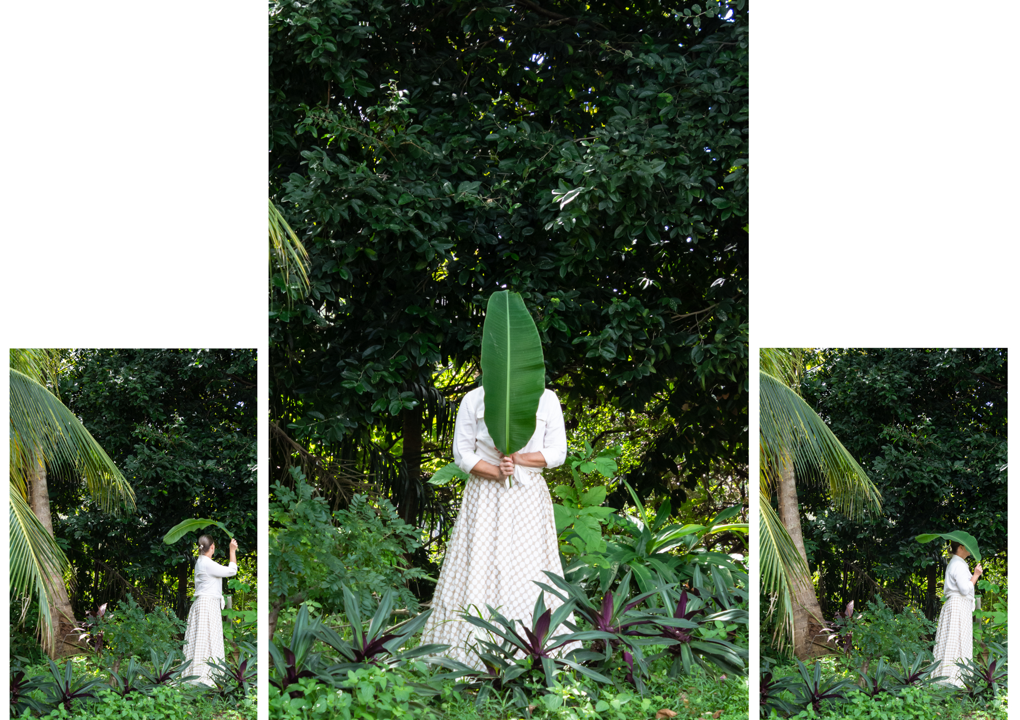Foi, ao caminhar pelos arredores de meu corpo e do espaço que ocupo nesse mundo, que pude sentir a força vital da natureza e a importância da sua existência. Eu sou parte do todo, não sou uma coisa e a natureza outra. Descobri tantas belezas que eu mal consigo explicar a mim mesma. Todos esses sentimentos me fazem entender que é imprescindível cuidar, proteger, me envolver, me reintegrar a esse mundo chamado natural do qual fui afastada pela cultura. A série Arredores surgiu da experimentação desse envolvimento com a natureza, eu quis brincar de ser árvore, de ser planta, eu quis ser parte. Eu quis sentir, tocar, me enraizar. Também propus-me pensar as relações entre natureza e cultura ao abusar da pose, das roupas, da estranheza gerada pela ausência de uma identidade específica pela obliteração do rosto.