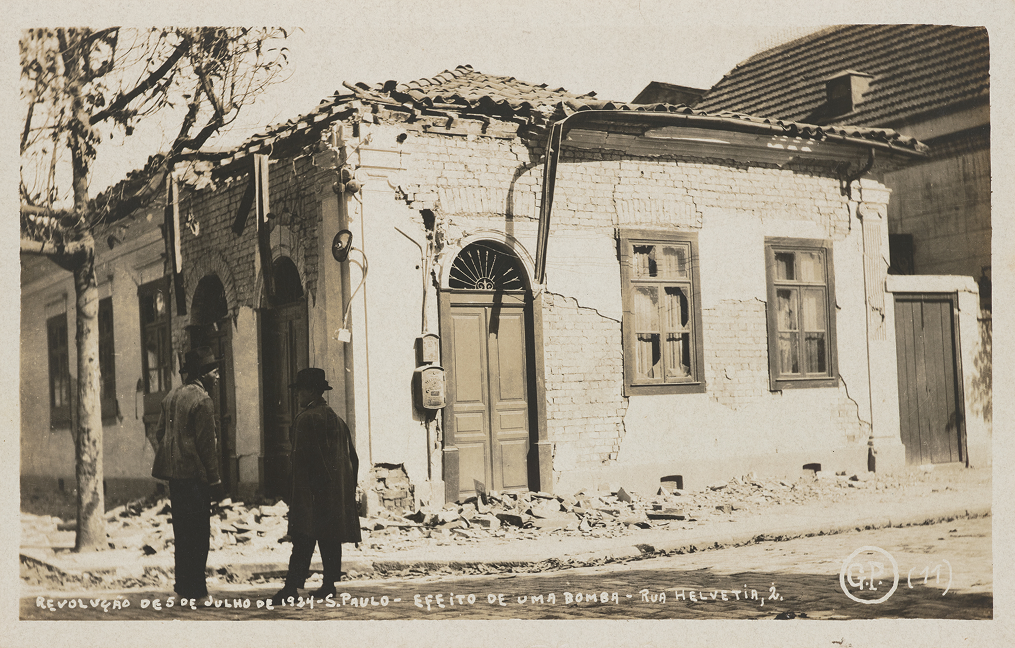 O que propomos nesta exposição é agregar, de forma bastante desprendida, mais uma camada ao caleidoscópio de olhares que se sedimentam sobre essa geografia: a camada do conflito. Como ponto de partida, escolhemos uma fotografia feita por Gustavo Prugner em 1924: um cartão postal gentilmente cedido pelo Instituto Moreira Salles. A imagem mostra dois homens, um negro e um branco, que conversam diante de uma casa despedaçada, com parte da estrutura à mostra. O imóvel, como lemos na legenda do autor, sofreu o “efeito de uma bomba” na Revolução de 5 de julho. A casa atingida pela explosão localizava-se, diz Prugner, na Rua Helvetia, número 2.