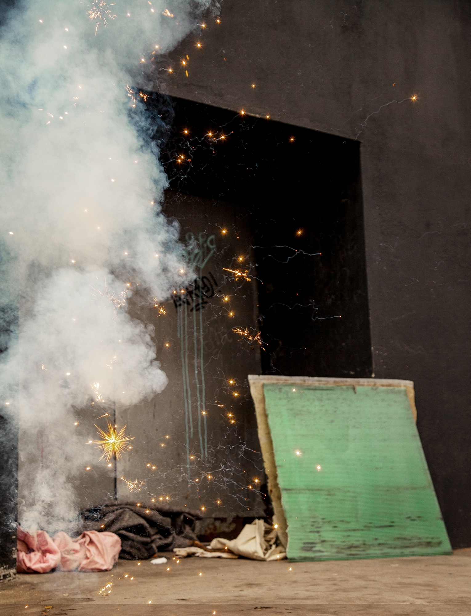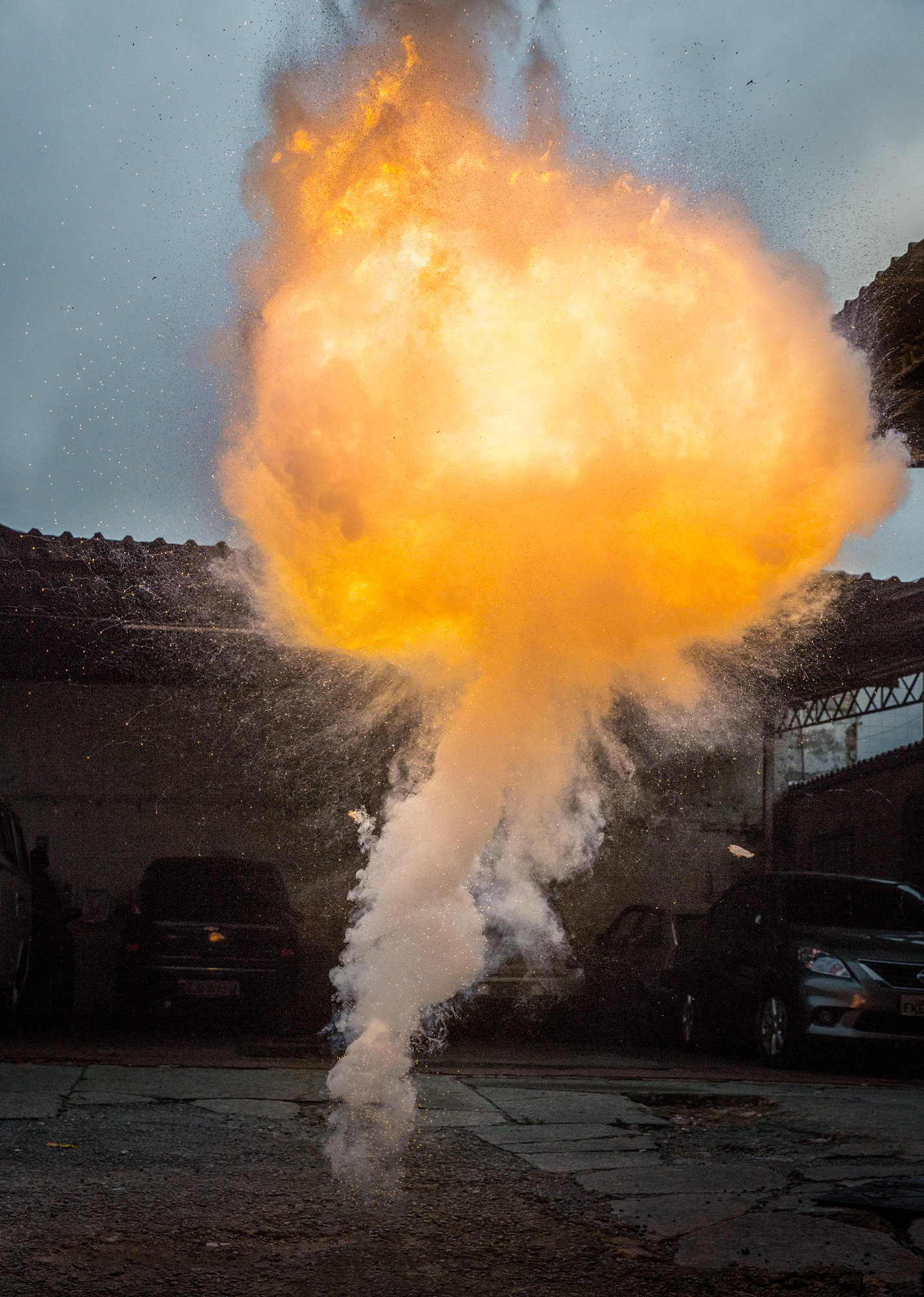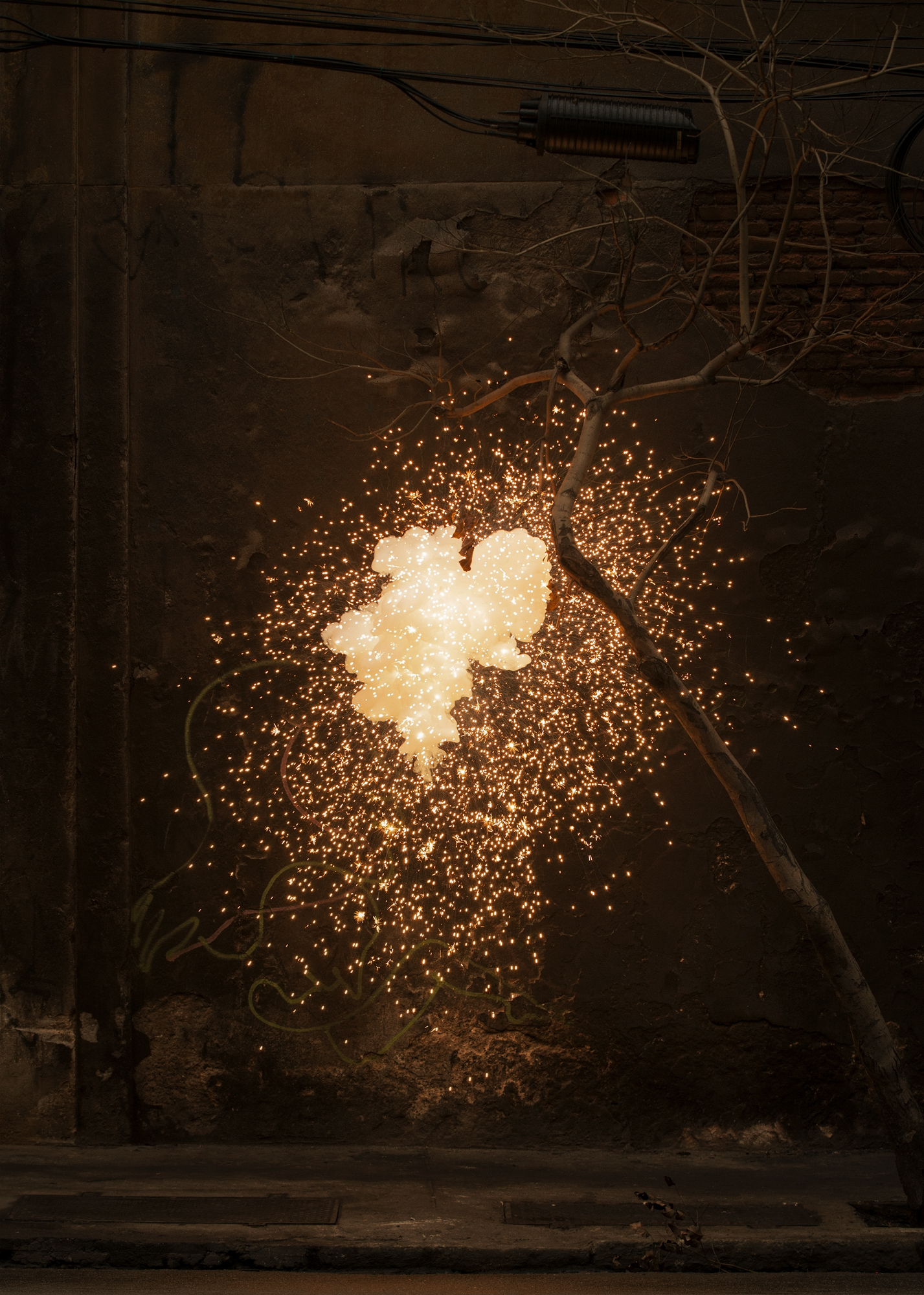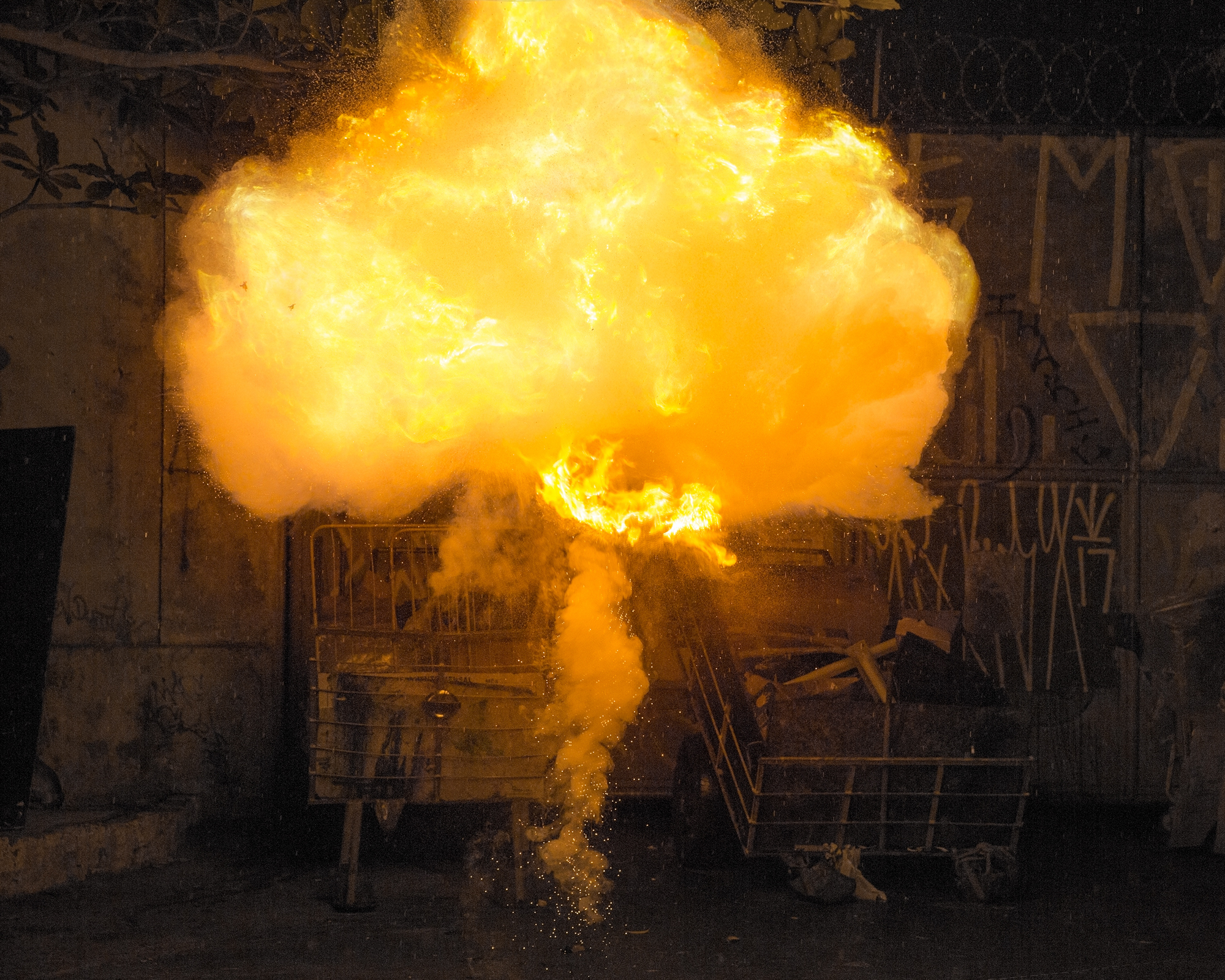 A exposição é composta aqui pelo postal de Prugner e por uma série de 9 fotografias coloridas de grandes dimensões, que mostram explosões controladas, criadas e fotografadas in loco. Recorremos, assim, ao artifício, à ignição inventiva sobre o território, para propor um olhar ambíguo, dialético sobre essas explosões que moldaram e moldam não apenas a geografia, mas também as suas dinâmicas históricas e sociais.