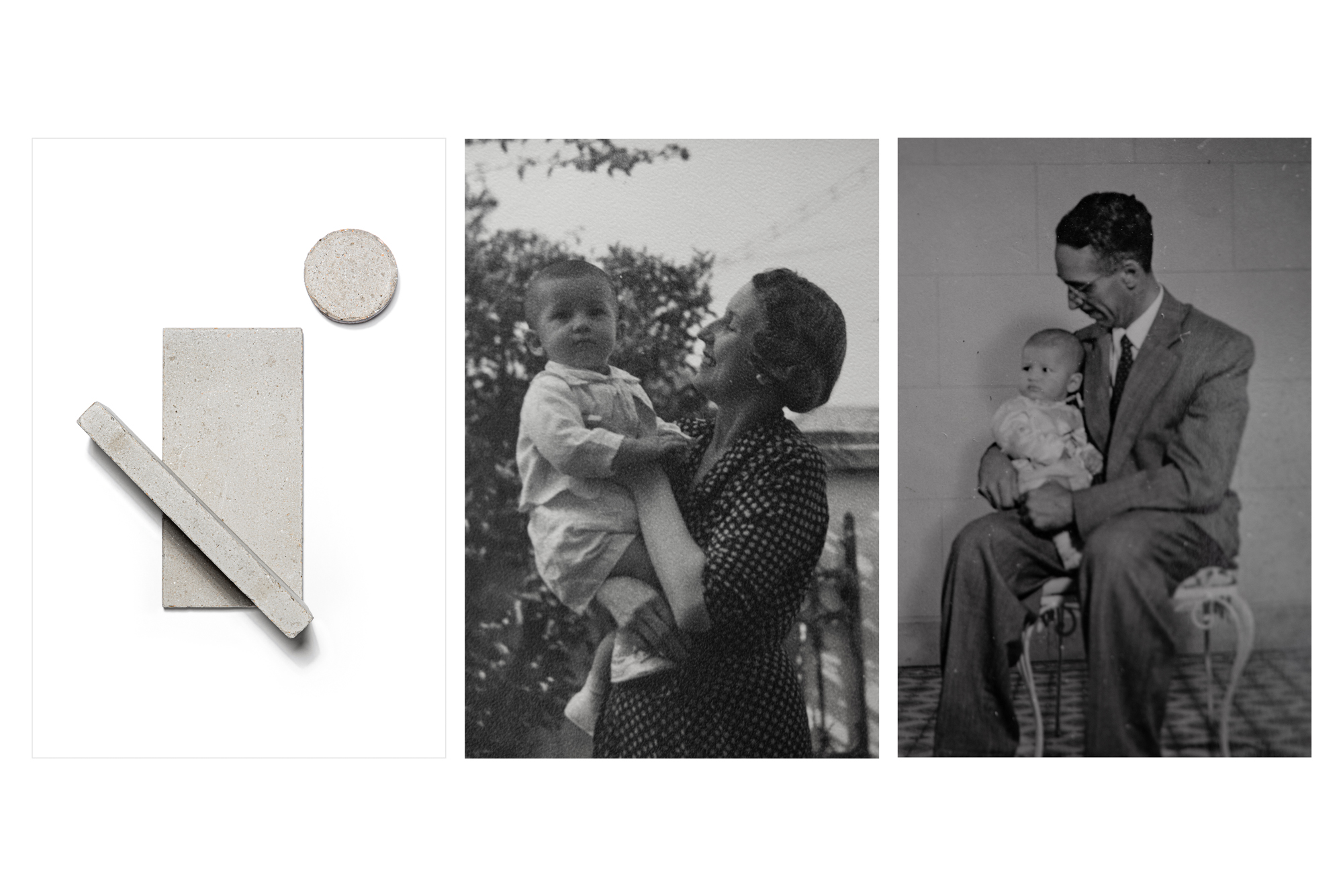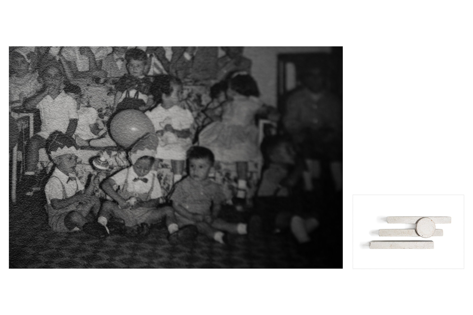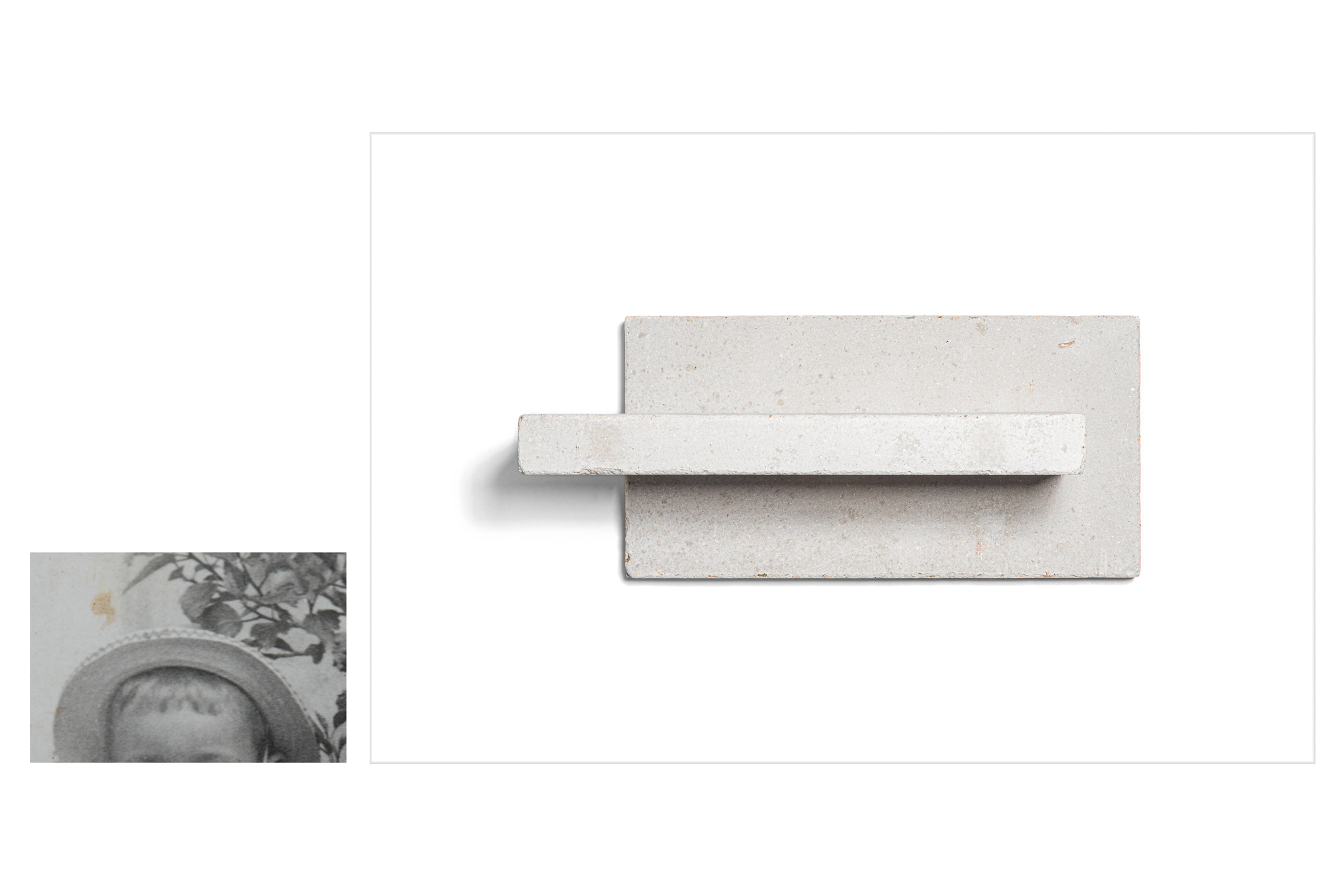 Como primeiro passo, recorto partes dessas fotografias em alusão à memória fragmentária. Procuro nesses recortes sua estrutura visual essencial, seu desenho mais simplificado e potente. A partir daí, empilho os blocos de concreto (mesma operação da transformação espacial), construindo com eles uma versão tridimensional dos desenhos que anteriormente descobri. Crio, assim, pequenas esculturas abstratas que tangenciam os fragmentos de memória. As formas criadas corporificam um espectro, ao mesmo tempo em que respeitam sua essência intangível. Ao fotografá-las, lhes devolvo a mesma característica de imagem bidimensional do recorte fotográfico, mas, diferentemente das fotografias de família antigas, sem a intenção de presentificar uma lembrança.