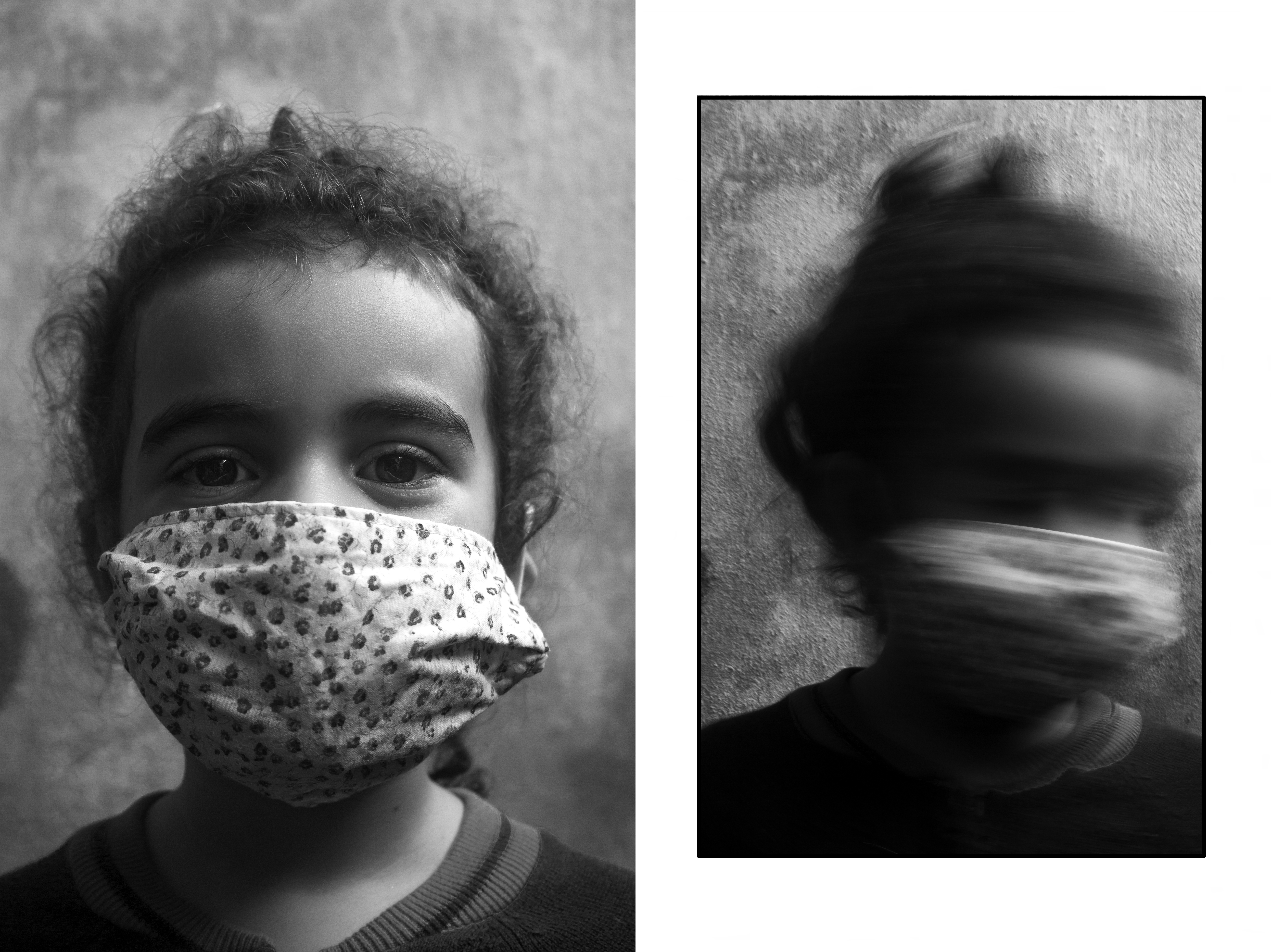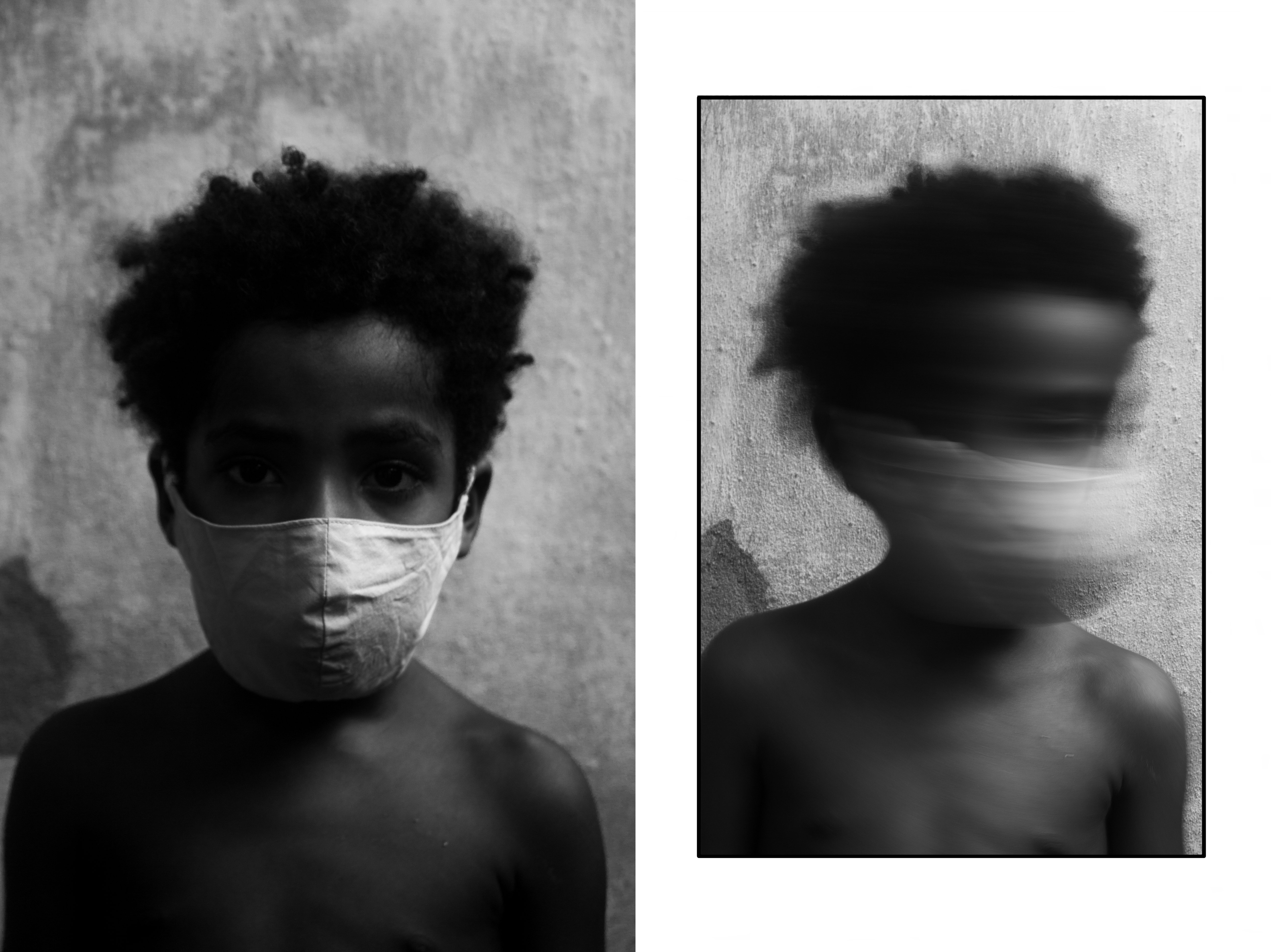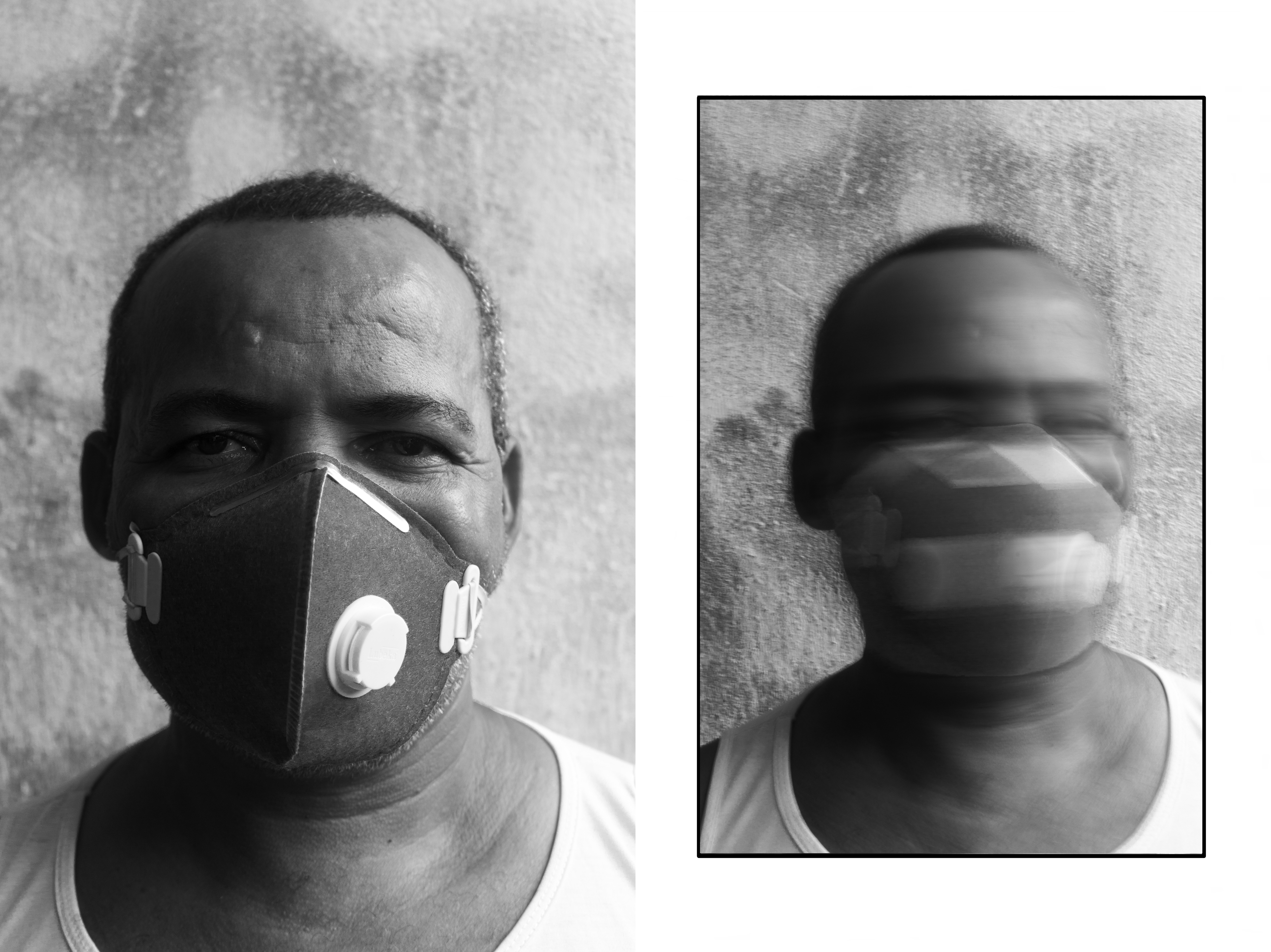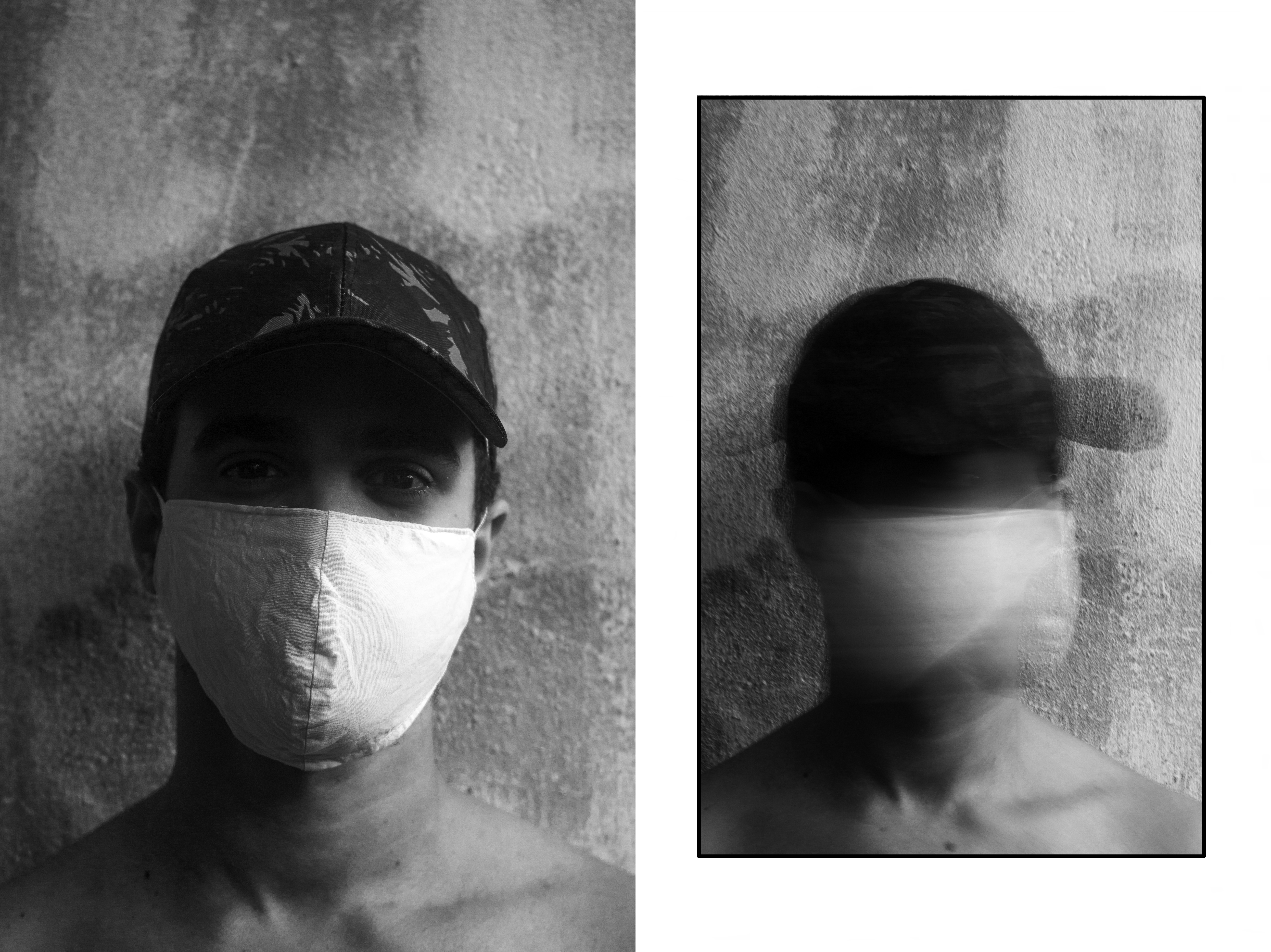 Durante a quarentena devido a pandemia de covid-19 decidi fotografar meus familiares com suas máscaras, usando a parede do terraço como fundo e utilizando a luz do dia como fonte de iluminação realizei o projeto que intitulei como máscaras, a ideia das duas fotos juntas foi mostrar como meus familiares se sentiam por dentro (angústia, isolamento, entre outros).